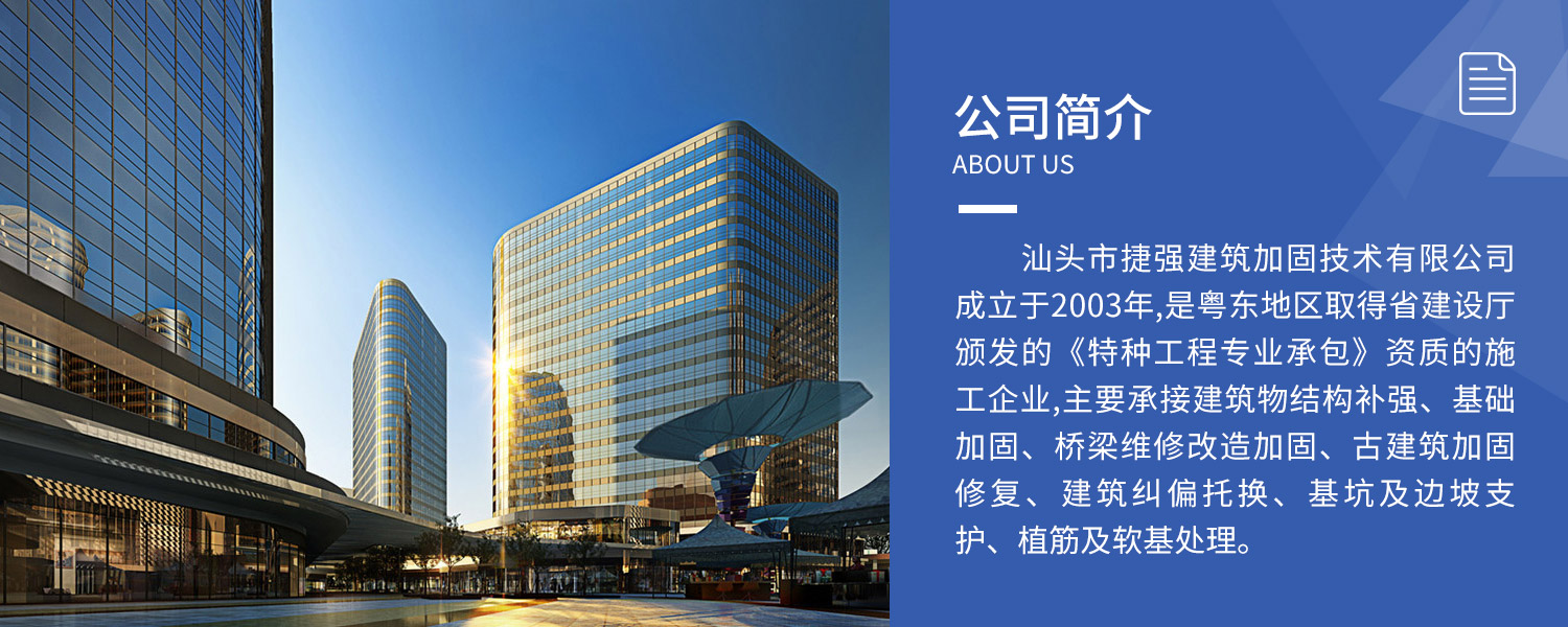 • 汕頭市捷強建筑加固技術有限公司是粵東地區取得省建設廳頒發的《特種工程專業承包》資質的施工企業。